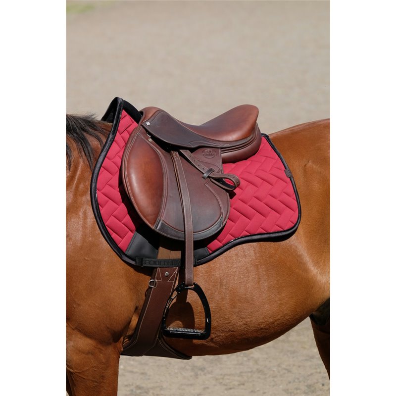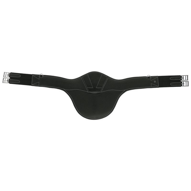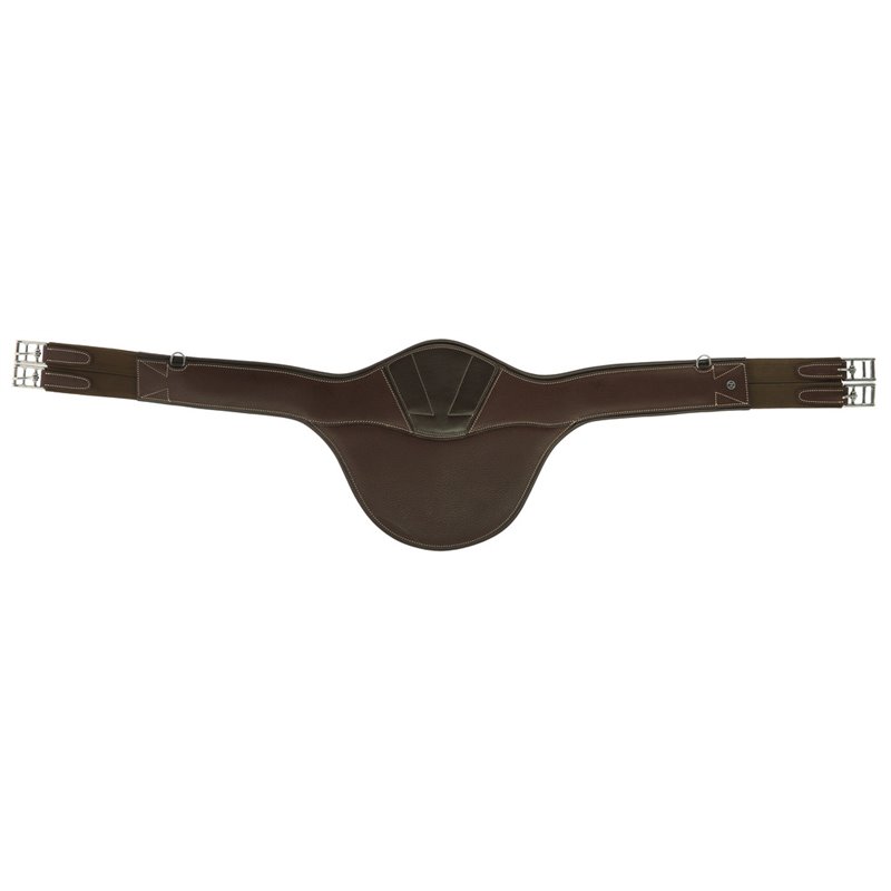 Sattelgurt mit Stollenschutz aus genarbtem Büffelleder, gefüttert mit Rindsleder. DETAILS: - Zentrale Karabinerhaken, verdeckt durch eine magnetisierte Klappe aus Büffelleder - 1 Ring auf jeder Seite des Gurts - Dreifach geschichtete Elastiken an jedem Ende - Rollenschnallen aus Edelstahl