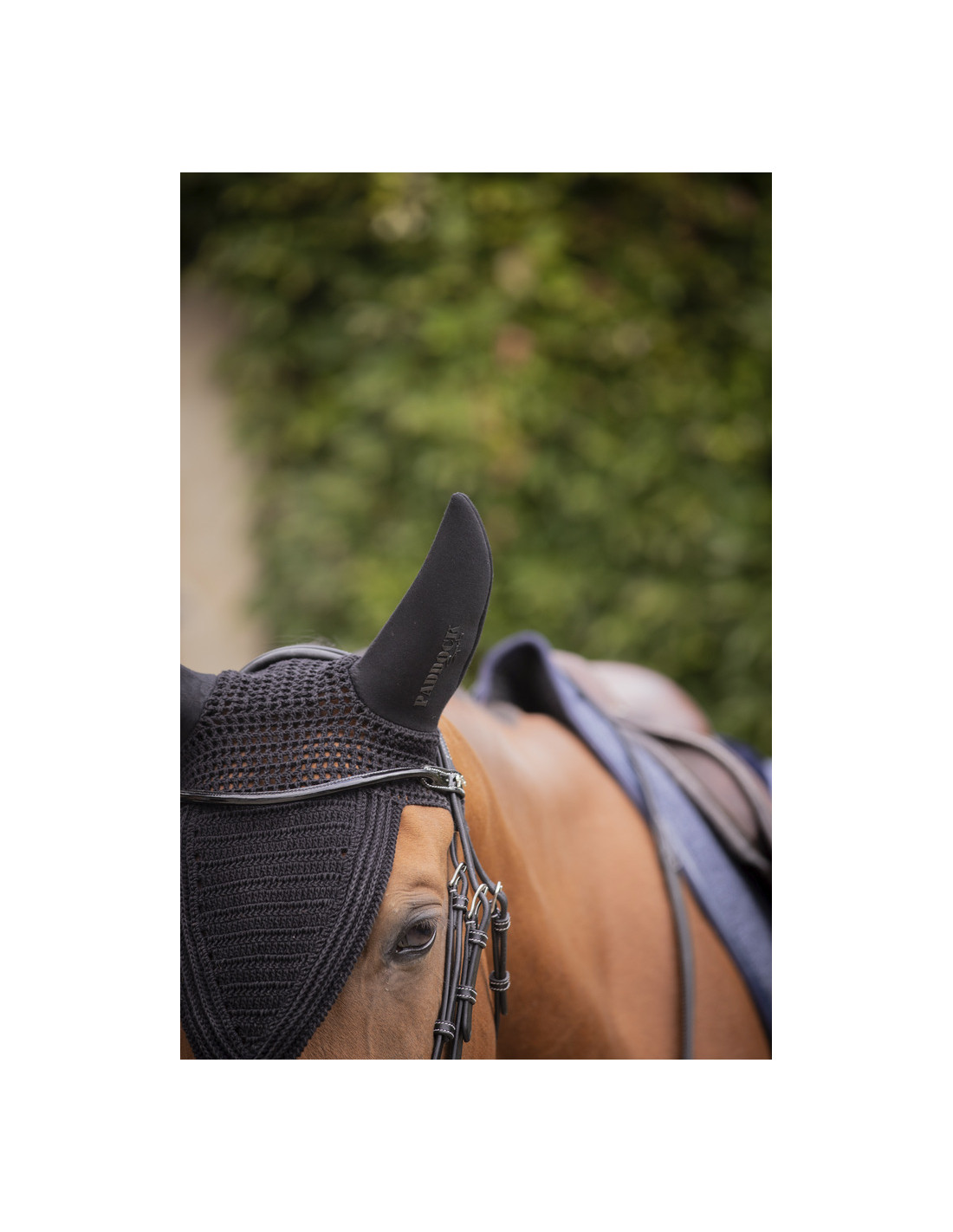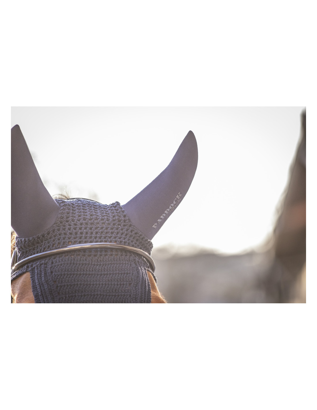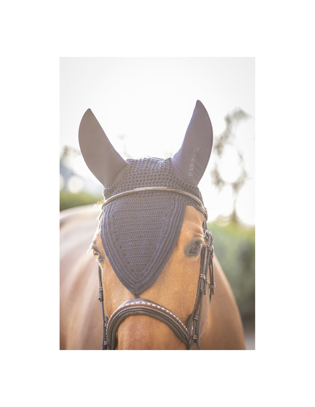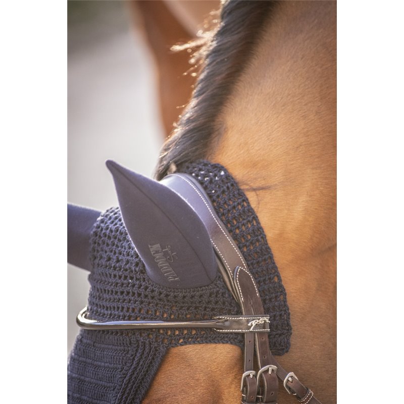 Hergestellt aus einem recht dichten Gewebe, passt diese Haube perfekt auf den Kopf des Pferdes. Die Ohren sind mit weichen Einsätzen ausgestattet, die das Pferd vor Insekten, Lärm und Witterung schützen und so seine Konzentration fördern.