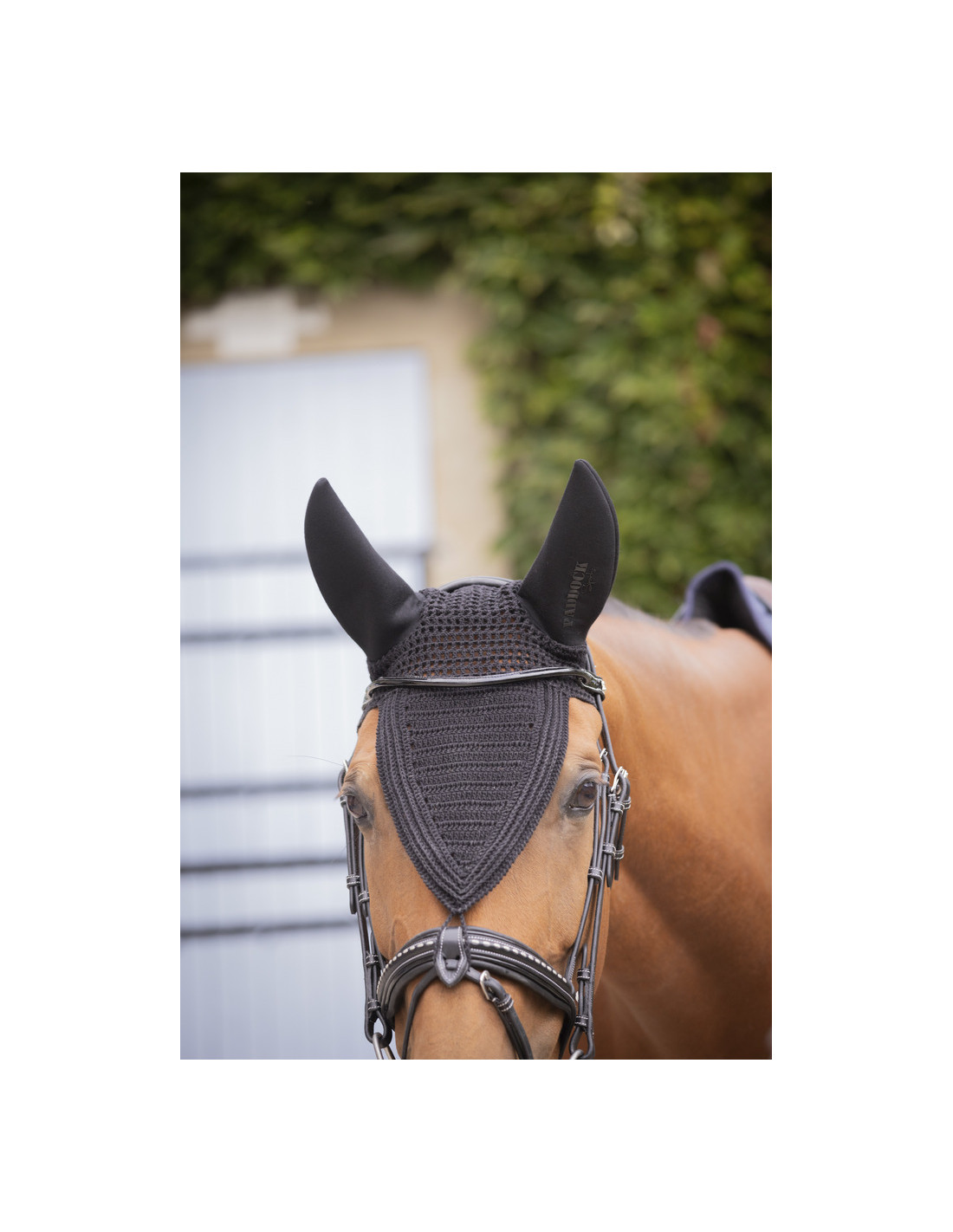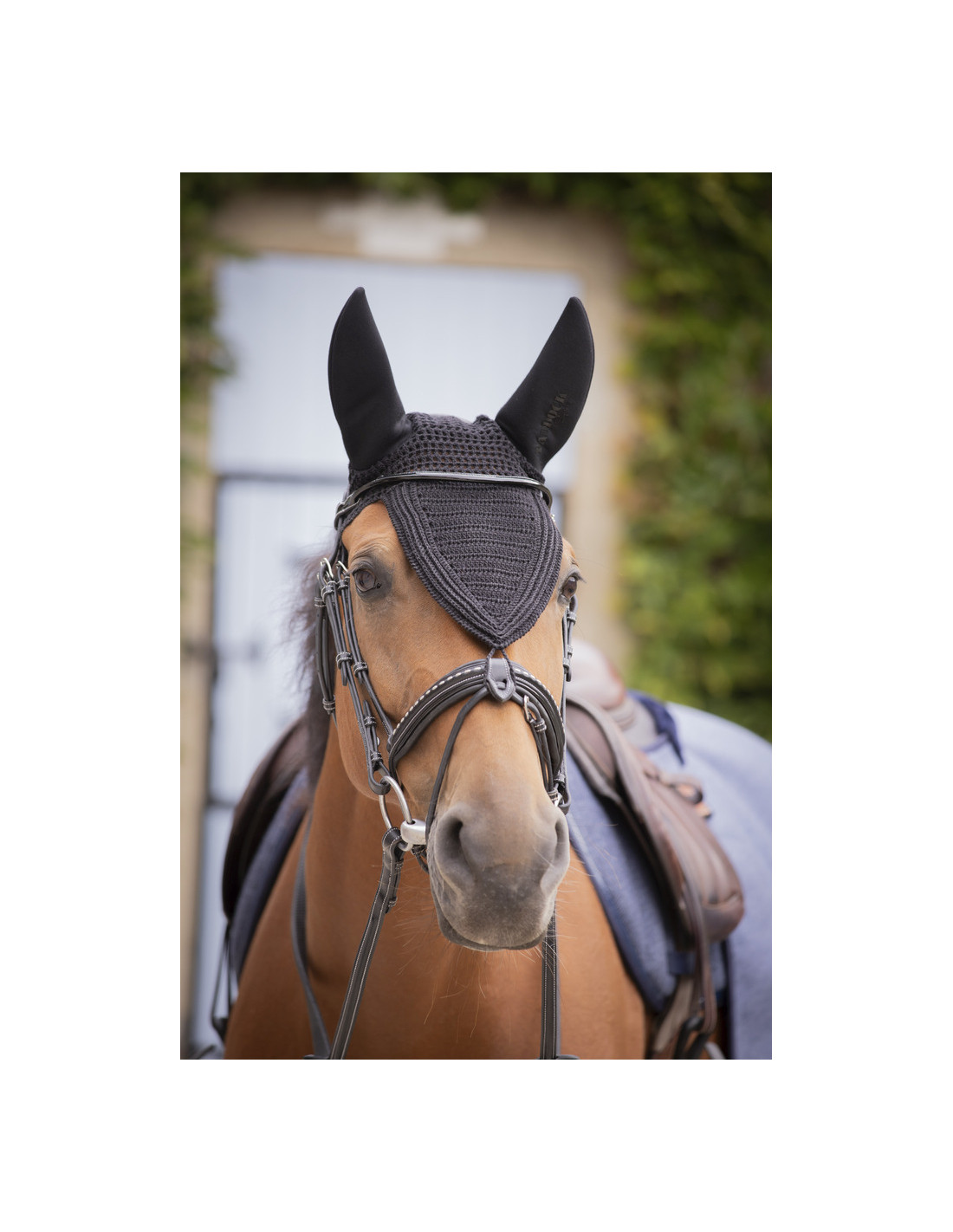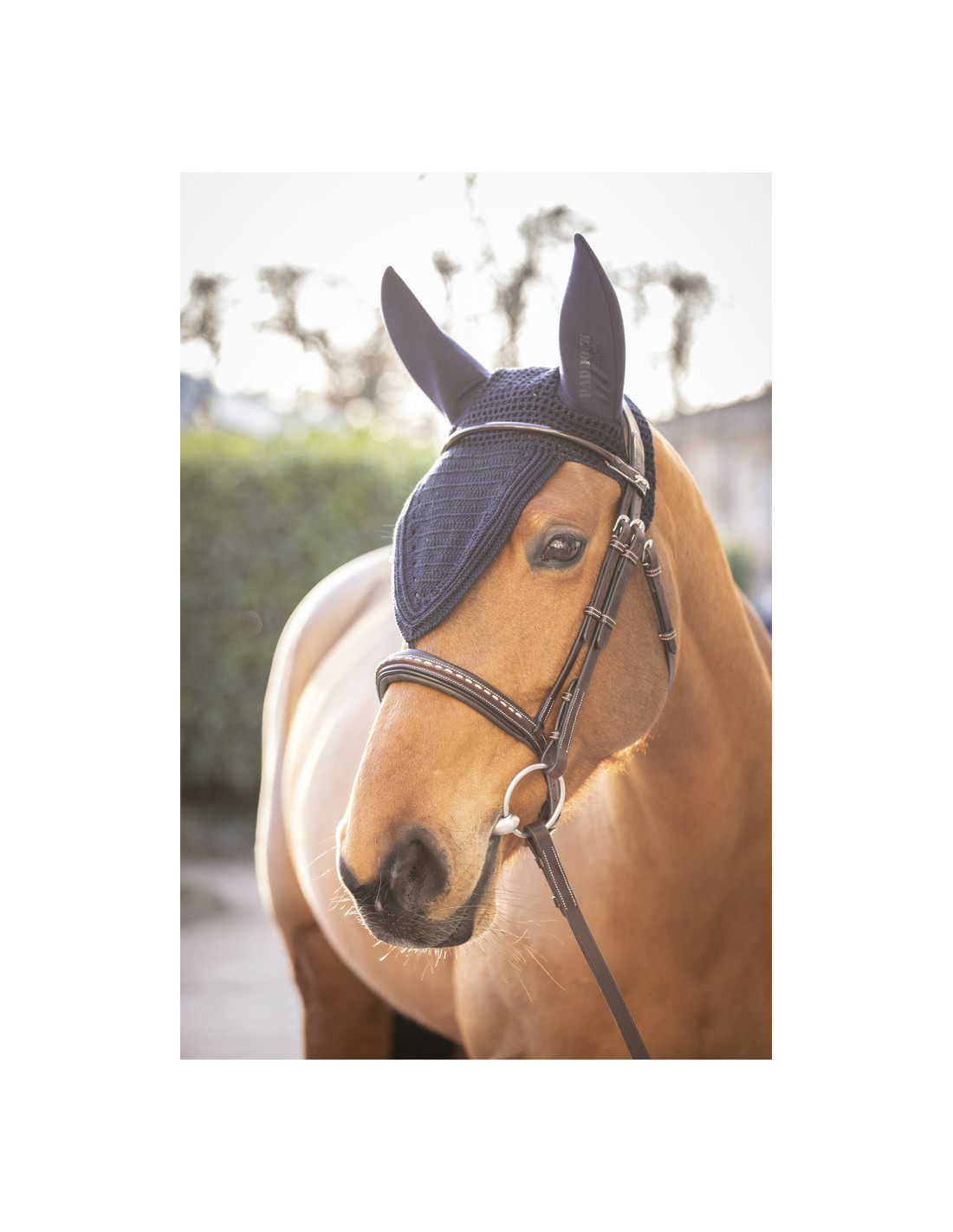 Hergestellt aus einem recht dichten Gewebe, passt diese Haube perfekt auf den Kopf des Pferdes. Die Ohren sind mit weichen Einsätzen ausgestattet, die das Pferd vor Insekten, Lärm und Witterung schützen und so seine Konzentration fördern.