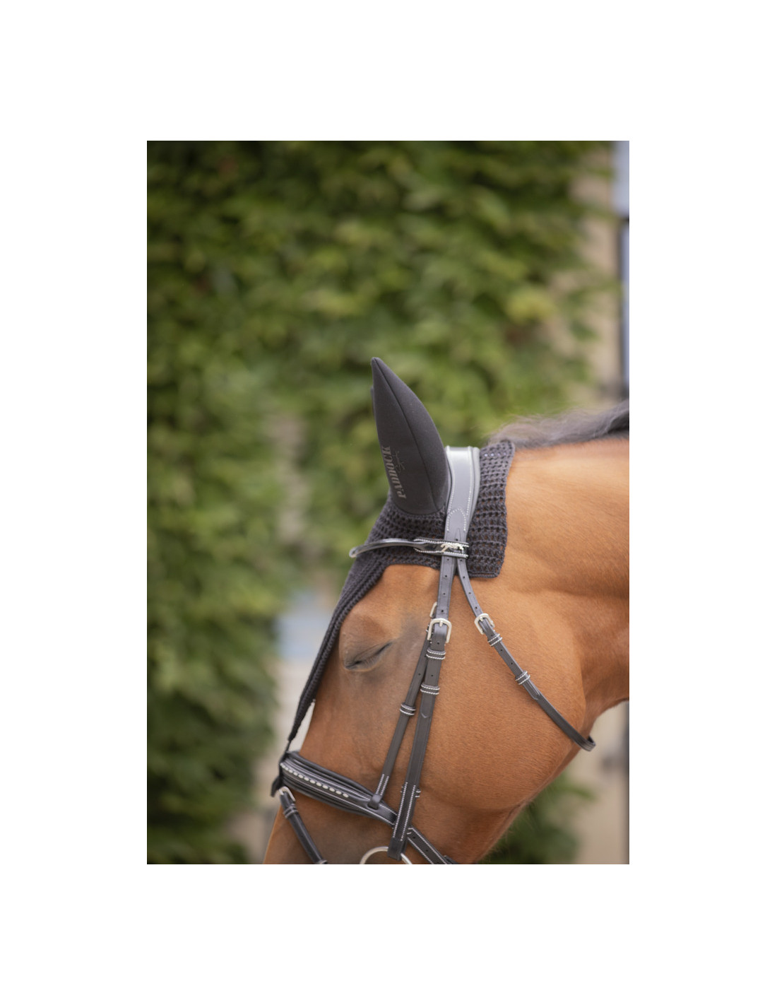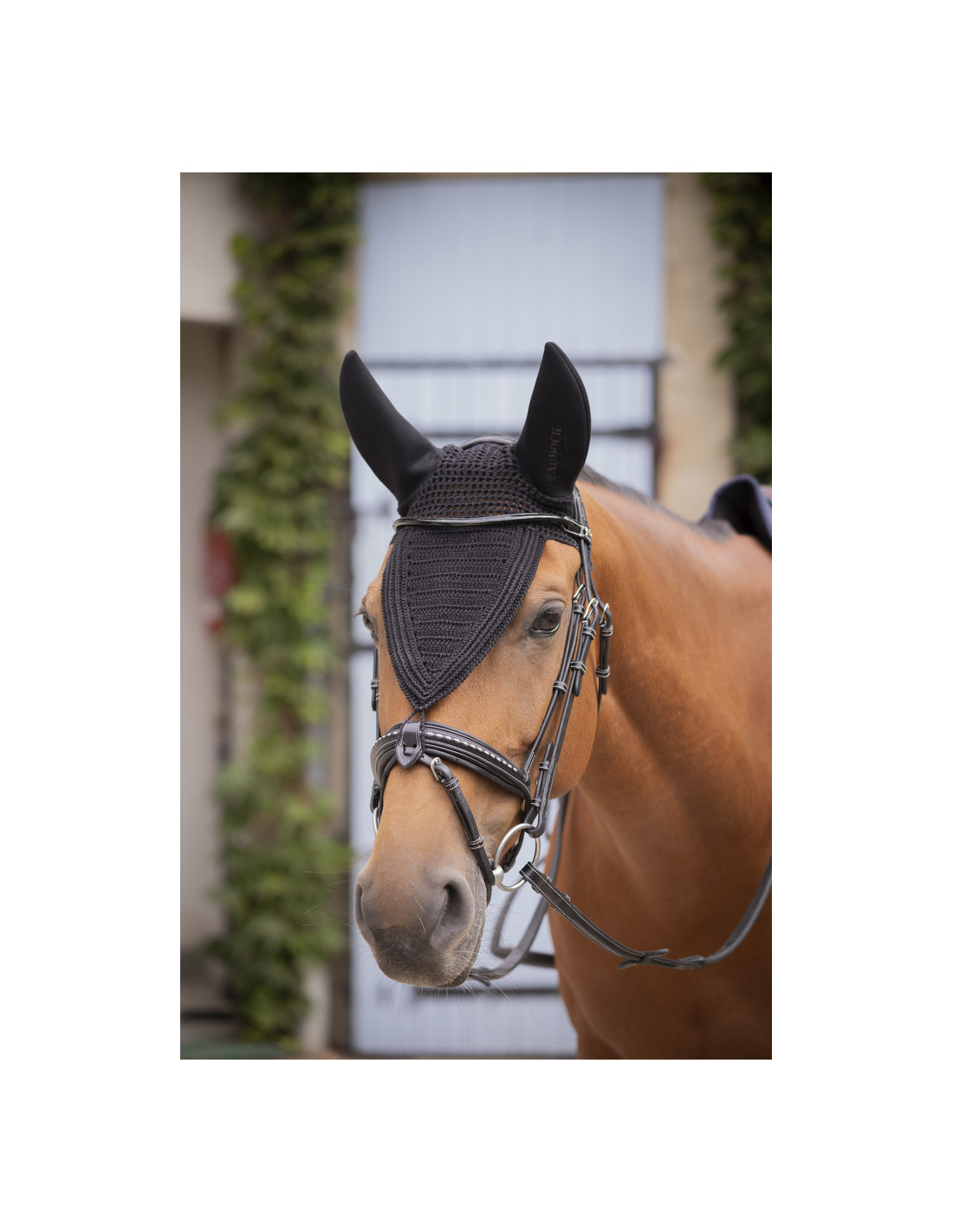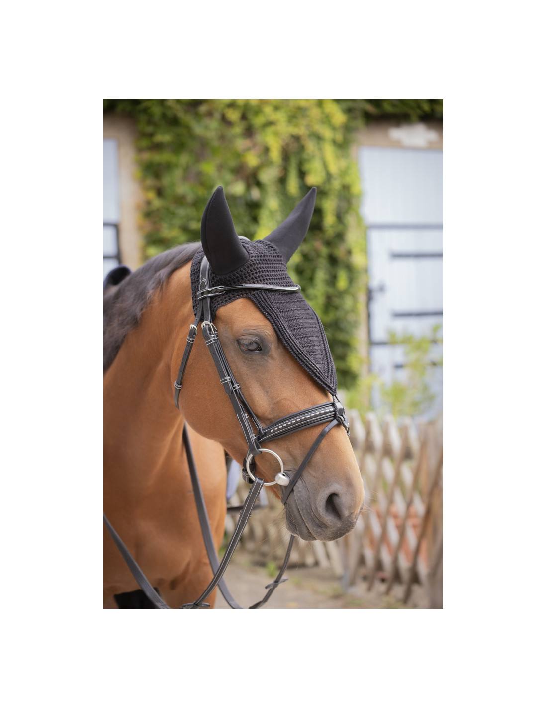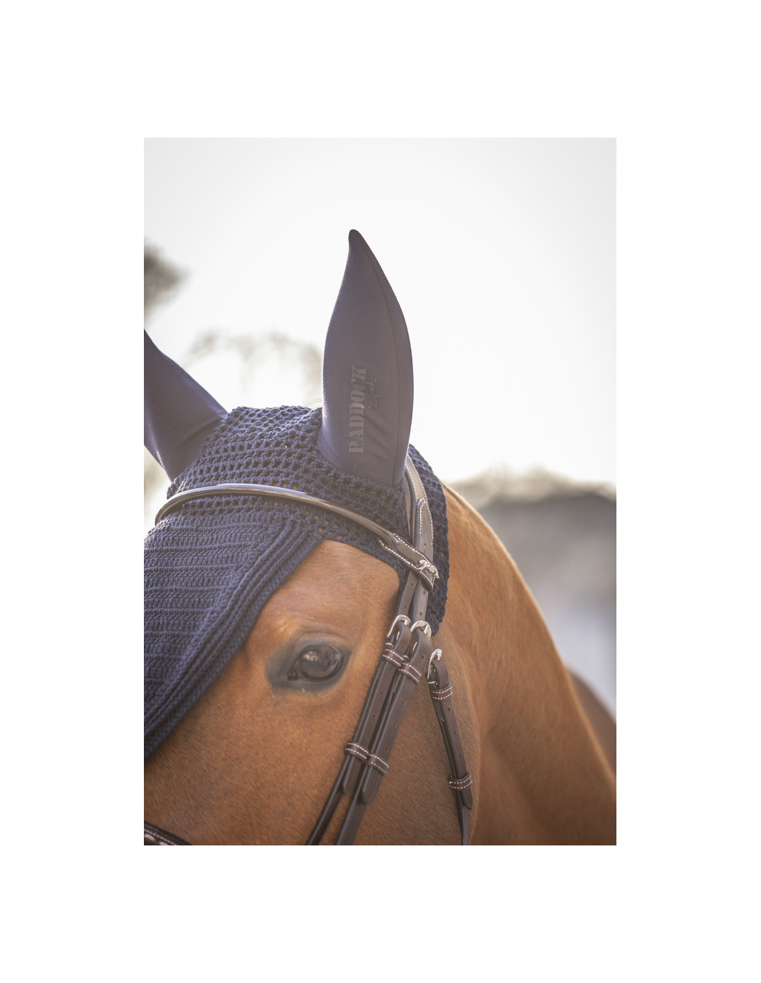 Hergestellt aus einem recht dichten Gewebe, passt diese Haube perfekt auf den Kopf des Pferdes. Die Ohren sind mit weichen Einsätzen ausgestattet, die das Pferd vor Insekten, Lärm und Witterung schützen und so seine Konzentration fördern.