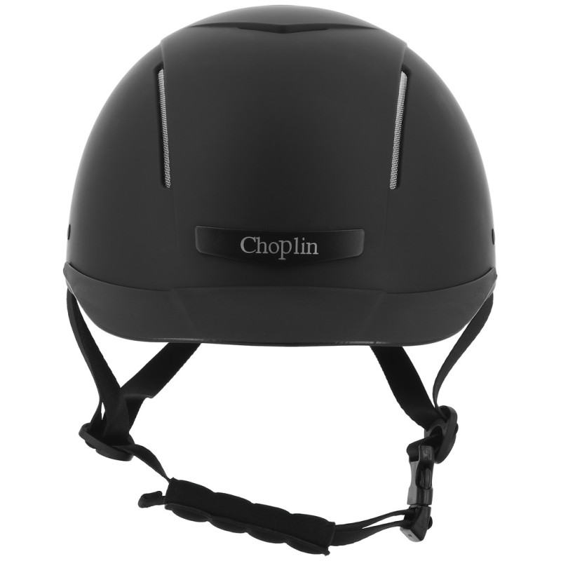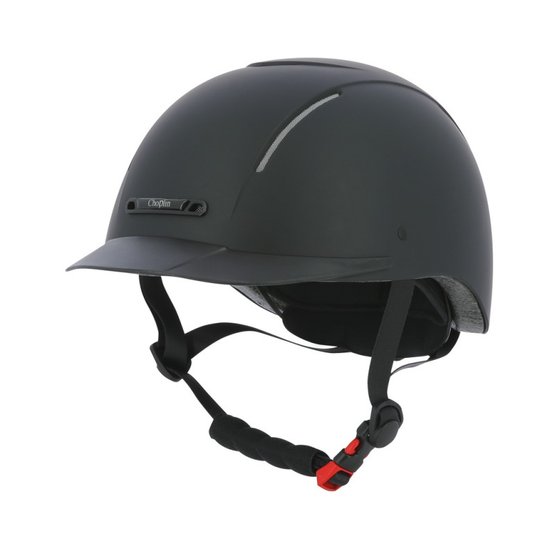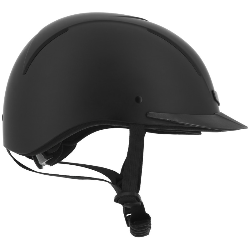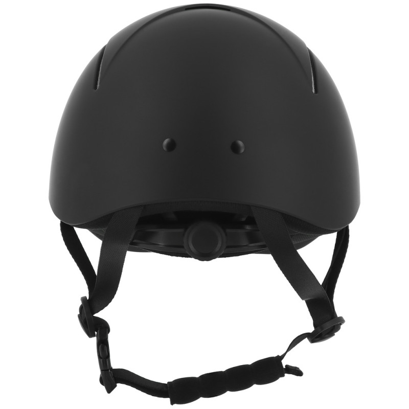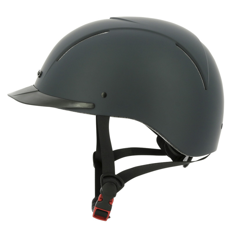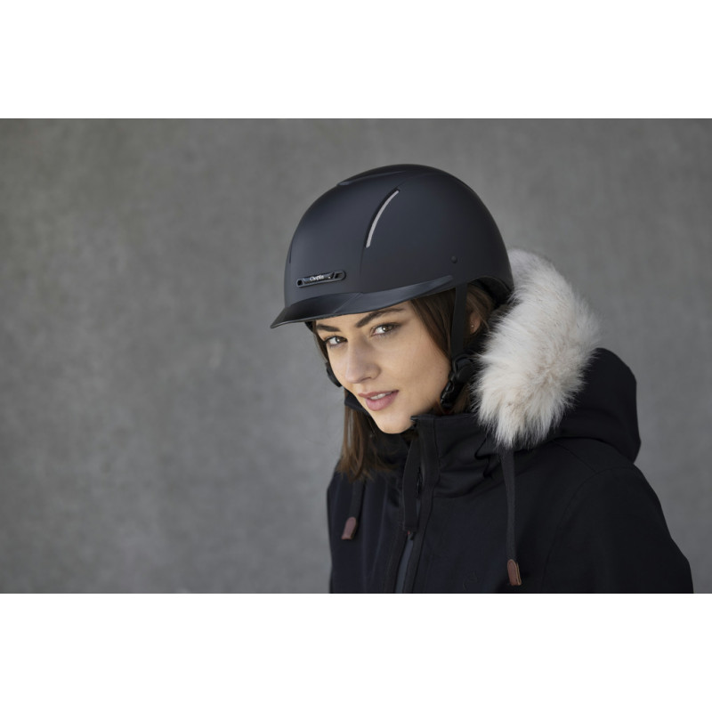 Glatte, matte und extrem robuste ABS-Außenschale, deren Schutzeigenschaften auch bei extremen Temperaturen erhalten bleiben. Innenschale aus sehr leichtem, hochverdichtetem EPS (expandiertes Polystyrol) mit hervorragenden stoßdämpfenden Eigenschaften. Belüftungszone vorne und hinten und in der Mitte. Zusammen mit dem herausnehmbaren, waschbaren Polyesterfutter sorgen sie für eine schnelle Schweißableitung und eine optimale Luftzirkulation im Helminneren. Das bei 30 °C maschinenwaschbare Innenfutter wird mit Klett befestigt. 3-Punkt-Steckverschluss für eine rasche Befestigung. Durch Drehknopf verstellbarer Kopfumfang, biegsamer Schirm. Kinnschutz und Weitenregler gepolstert. Reithelm mit CE-Prüfzeichen entsprechend der Norm EN1384/2012-02, modifiziert durch das Koordinationsblatt VG1 01.040 2014-12,, zertifiziert vom TÜV Rheinland.
