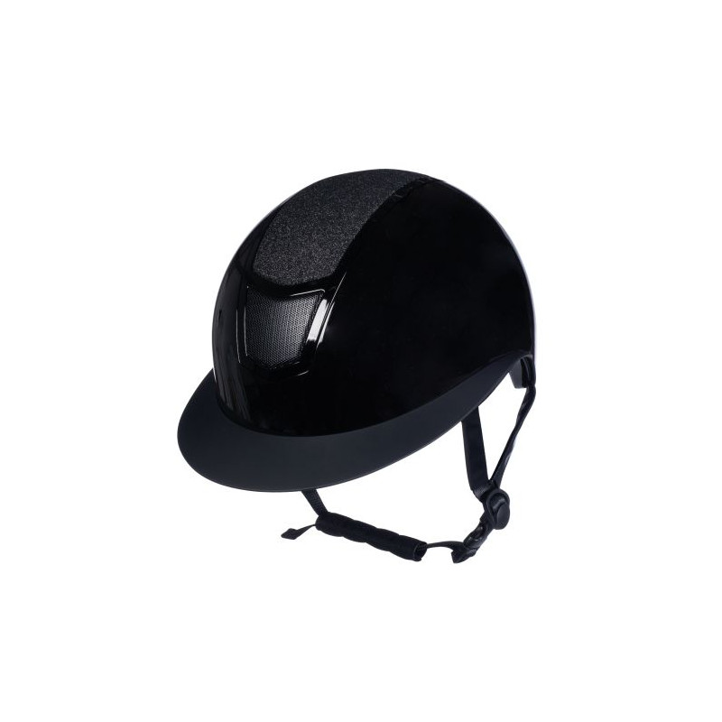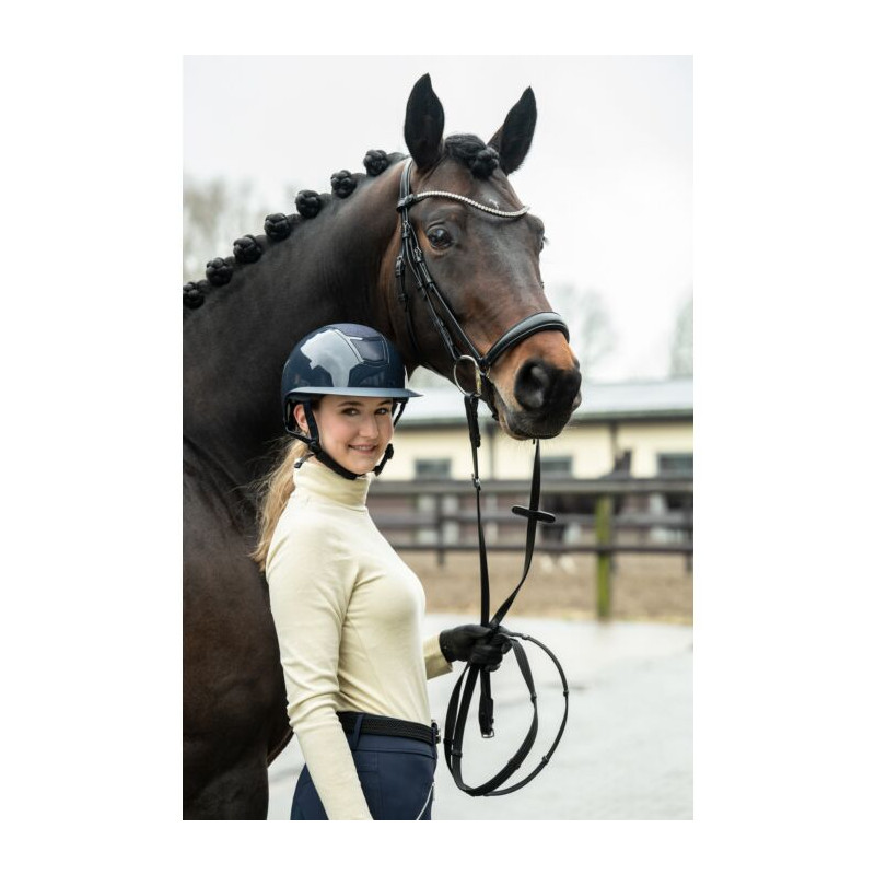 Der Reithelm Shiny Diamond ist das neue Flagship-Modell unter den Reithelmen von HKM. Er ist stark glänzend, lediglich der Schirm ist im matten Grundton gehalten. Darüber hinaus ziert den Reithelm in der Mitte eine stark glitzernde Partie, die im Ton der Grundfarbe gehalten ist und den Reithelm noch mehr scheinen und glänzen lässt. Vor und hinter der Glitzerpartie verfügt der Helm über dezent angelegte Belüftungsbereiche, die ein angenehmes Klima unter dem Reithelm fördern. Durch ein Drehrad lässt sich der Reithelm stufenlos und individuell einstellen. Von innen ist der Reithelm Shiny Diamond weich abgepolstert, das Innenfutter ist mittels Klettung herausnehmbar. Er verfügt über eine stoßabsorbierende Innenschale und schlagfeste Außenschale sowie weich gepolsterte Kinn- und Nackenriemen. Damit bietet der Designhelm maximalen Schutz bei optimaler Passform. Die gesamte Bauweise aller Reithelme von HKM ist speziell auf den Reitsport abgestimmt und alle Reithelme erfüllen die aktuell gültige Reithelmnorm. Lieferung im praktischen Stoffbeutel.