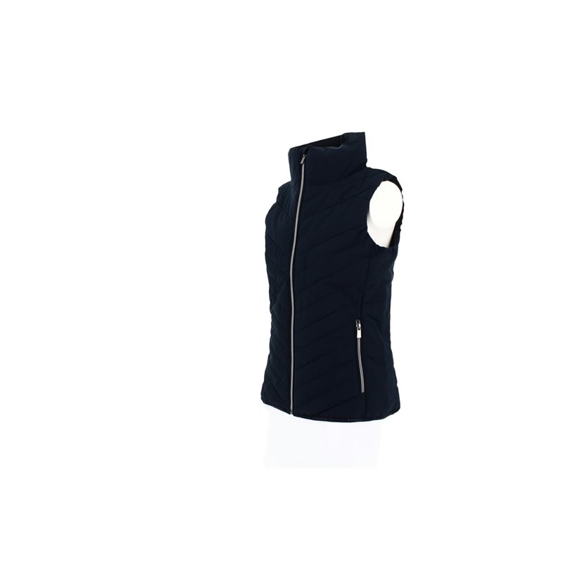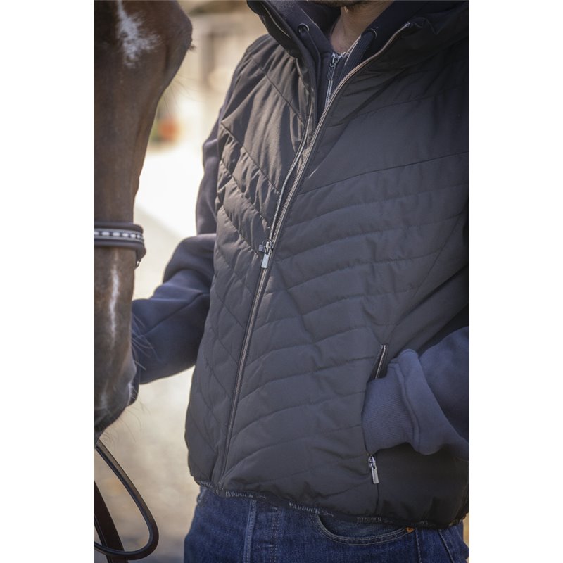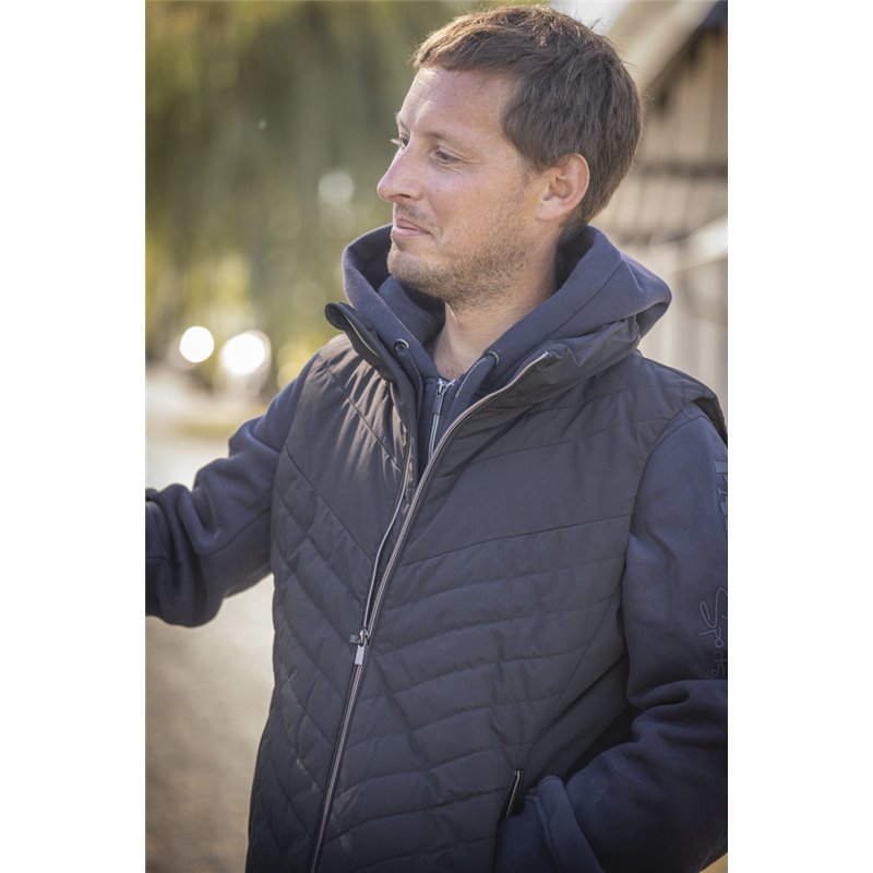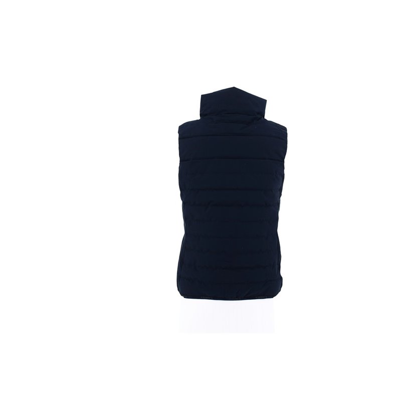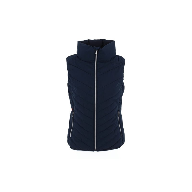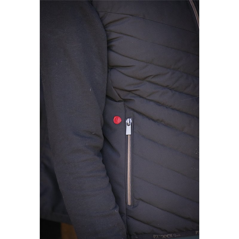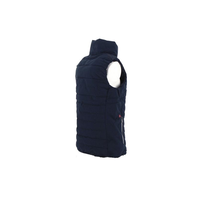 Ärmellose Weste PADDOCK mit Reißverschluss vorne und Paddock Sports-Branding aus mattem Silikon Ton-in-Ton auf der Schulter. Sie hat zwei Reißverschlusstaschen auf der Vorderseite und einen Stehkragen, der gut gegen Kälte isoliert. In der Ecke der rechten Tasche befindet sich eine kleine, runde, rote Markierung mit einem P, die wie ein Siegel aussieht. Es ist eine gemischte Weste, die von XXS bis XXL erhältlich ist. In Marine oder Schwarz