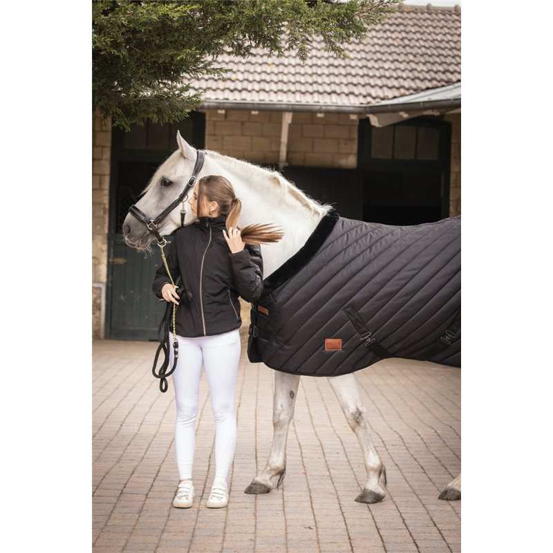 Stalldecke für den Winter Paddock Sports. Leicht erkennbar an der diagonalen Steppungmit einer 400g Füllung, bietet sie eine schöne Wärme für Pferde in der Box. Eine schwarze Verstärkung aus synthetischem Schaffell ist am gesamten Halsausschnitt angebracht und verleiht dem Produkt einen schicken Touch. Nur in Schwarz erhältlich. Erhältlich in den Größen 6.3, 6.6 und 6.9 Waschempfehlung: Unsere Boxendecke "Diagonal" kann bei 30°C in der Waschmaschine gewaschen werden