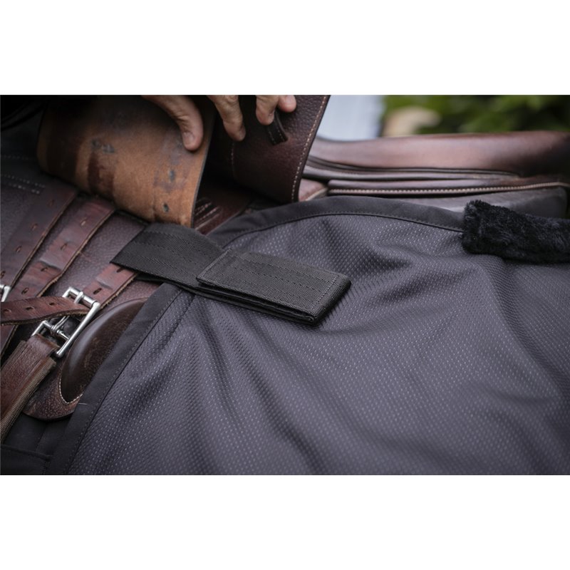 „Quarter PADDOCK Sports Nierendecke aus wasserabweisendem Material, mit einer dünnen Schicht Fleece gefüttert. Sie wird mit einem Klettverschluss an den Sattelgurten befestigt. Der Bereich, der sich an die Rückseite des Sattels schmiegt, ist mit einem hübschen schwarzen Kunstpelz verstärkt. Sein dünnes Fleece bietet bei kaltem Wetter eine gute Wärmequelle. Seine wasserdichte Beschichtung sorgt dafür, dass Ihr Pferd bei schlechtem Wetter trocken bleibt. Sein Look ist schlicht, aber sehr schick, und er passt je nach gewählter Größe vielen Pferdegrößen und großen Ponys.