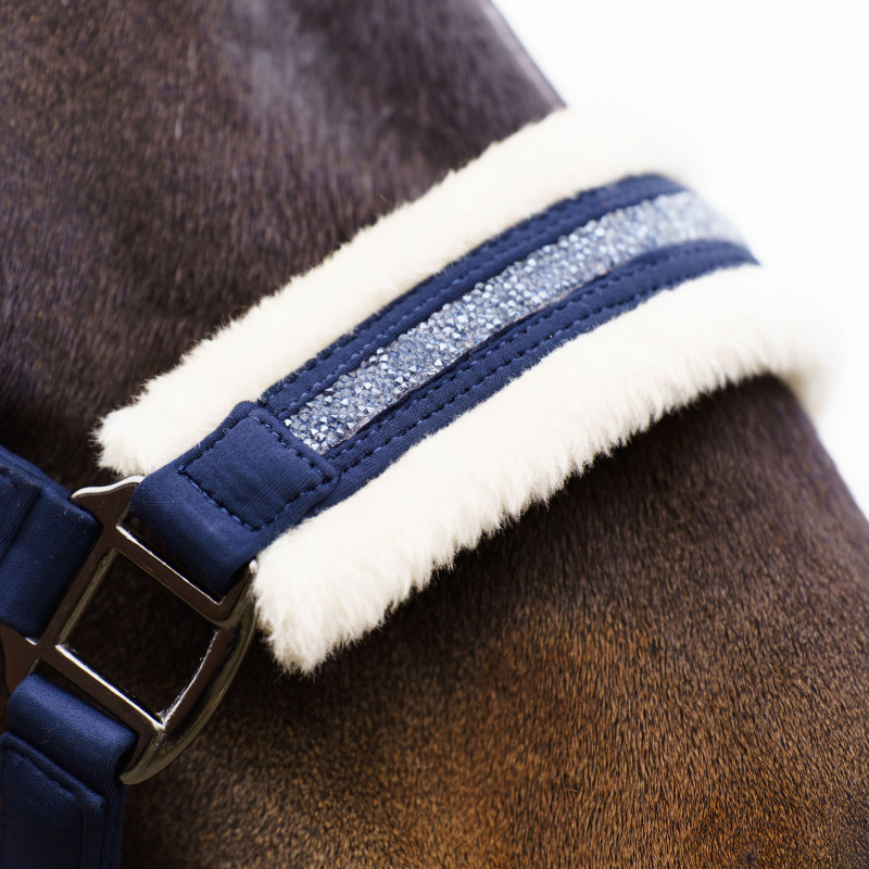 Verwöhnen Sie Ihr Pferd mit unserem Softshell-Halfter Jewel. Es weist glänzende Strasssteine an der Nase, eine Kunstfellpolsterung an der Nase und hinter den Ohren sowie unsere IR-Markenmünze auf.
