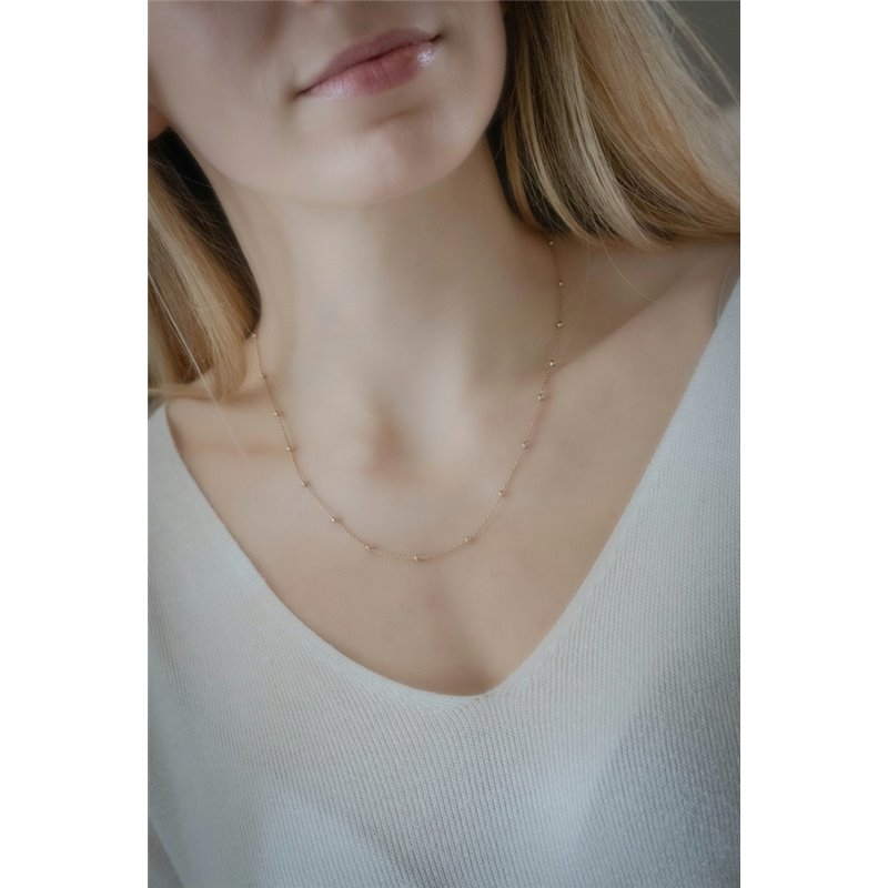 Chaine Pénélope "Eugénie" en couleur dorée. La chaine se porte en ras du cou, et est fermée grâce à un fermoir surmonté d'un pompom noir. La chaine se compose de manière régulière de petites boules dorées. Elle va avec le bracelet "Eugénie". Composition : laiton doré à l’or fin 24 carats 0,3μ