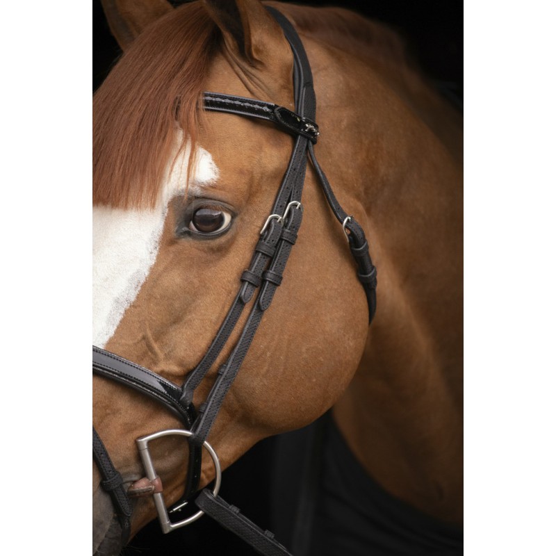 Bridon Oxford en cuir perforé noir au toucher doux. Il est doté d'une muserolle combinée vernie rehaussée d'un liseré pailleté. Son frontal, lui aussi verni noir possède des petits trous laissant entrevoir des petits points pailletés.
