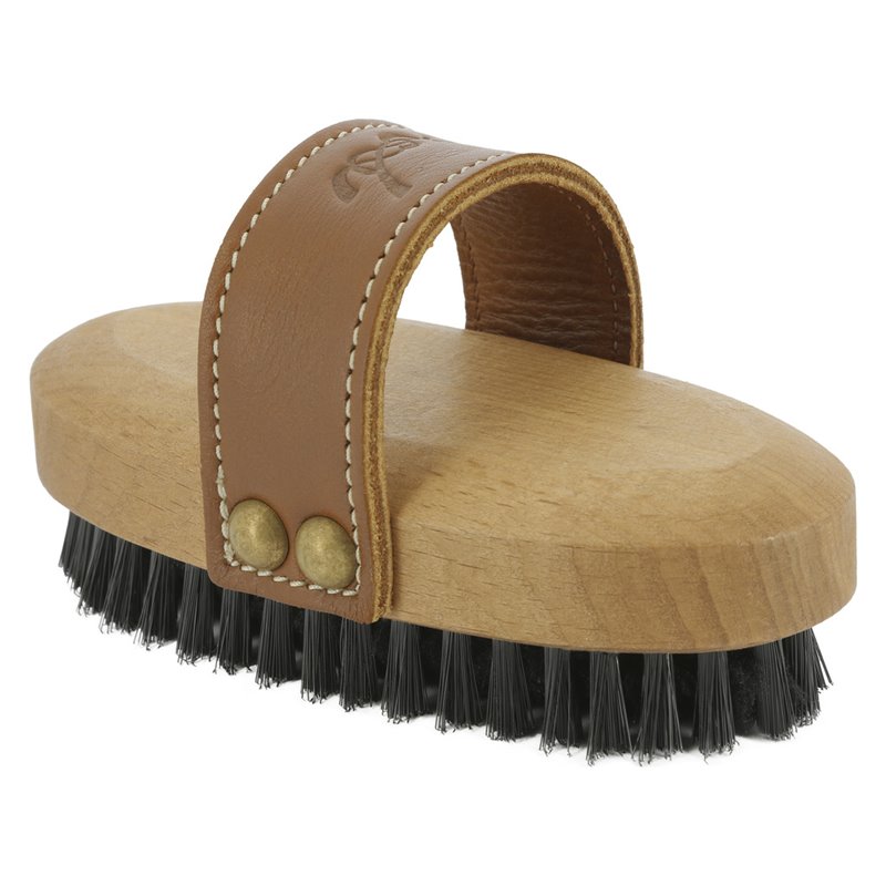 Brosse PENELOPE dotée de poils doux sur l'extérieur de l'ovale et d'une autre sorte, ultra douce à l'intérieur. Cette pièce de pansage permet de brosser des zones sensibles du cheval et lui apporter du confort. Elle est dotée d'une anse en cuir cognac pour une bonne prise en main et sur lequel le logo embossé Pénélope apparaît.