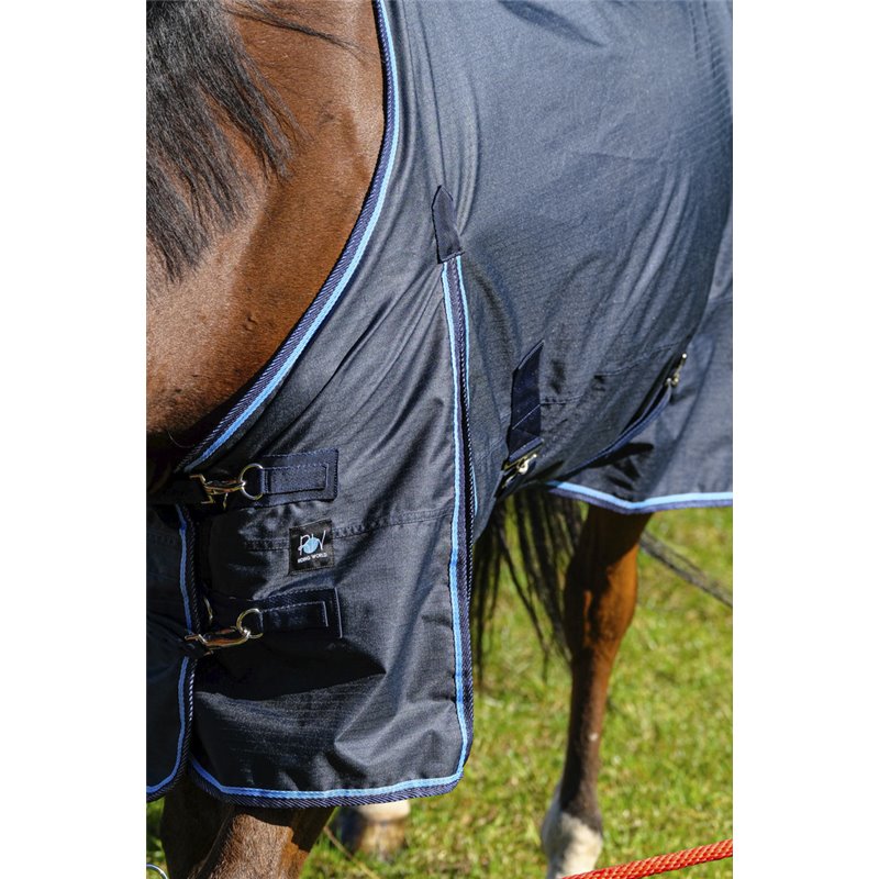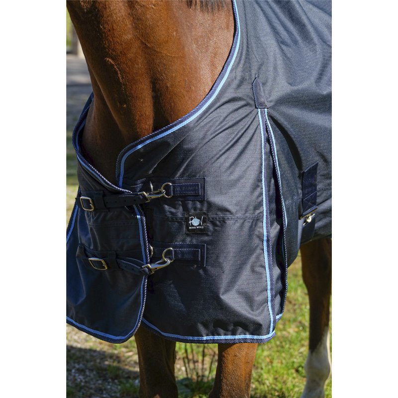 Couverture d’extérieur imperméable et respirante en polyester Ripstop 600 deniers 3000/3000 avec coutures thermo-soudées, doublure nylon. Equipée d’un très grand rabat de queue imperméable, d’un pli d’aisance, d’un pad de garrot en mouton synthétique, de sursangles croisées basses et de courroie de cuisses élastiqué. Fermeture de poitrail avec fixation rapide par boucles EasyClip, renforcée par bandes auto-agrippantes.