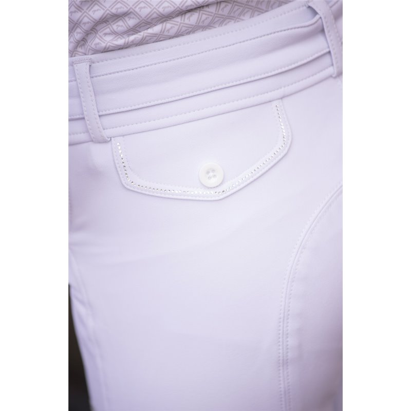 Pantalon d'équitation Élégance blanc Pénélope doté d'un rang de strass sur la sur-ceinture mais également le long des deux poches avant et arrière. Un petit cheval Pénélope, également en strass, est posé au milieu de la jambe gauche. Ce pantalon d'un grand confort, grâce à son tissu stretch a des renforts anti-dérapants à l'intérieur des genoux et une taille légèrement haute, bien emboitante. Le bas de jambe est en lycra pour s'adapter à de nombreuses morphologies. C'est une très jolie pièce féminie et confortable à porter en concours.