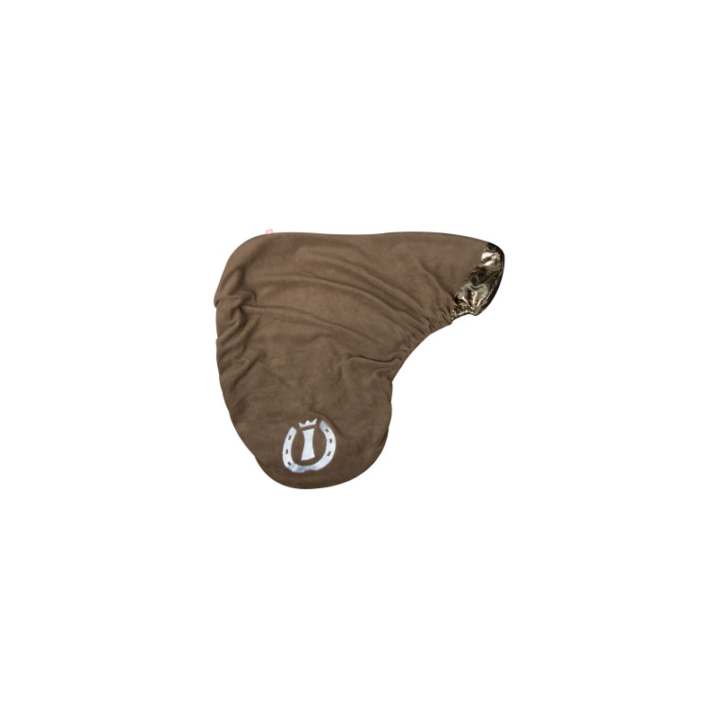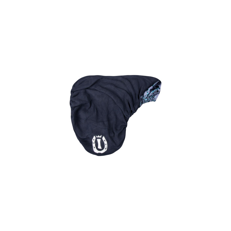 Housse de selle en micro polaire souple et extensible avec insert fantaisie en impression camouflage IR sur tissu satiné brillant.