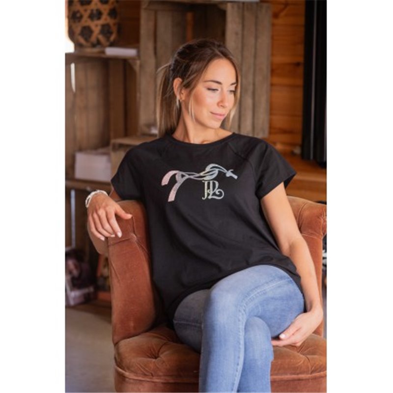 T-shirt noir manches courtes et orné d'un marquage du logo Pénélope en "croco arc-en-ciel" sur le devant.Il s'adapte aussi bien à la vie aux écuries qu'en ville. C'est un basic de la marque au look acidulé. Il se porte légèrement loose pour un confort dans l'air du temps.Composition : 95% coton et 5% élasthanneEn noirDu XS au XXL