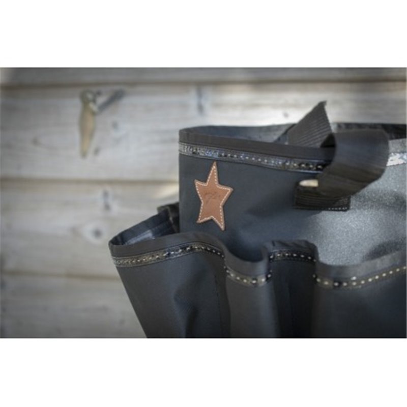 Sac de pansage "Grooming" Pénélope. Composé d'une grande poche centrale et de 8 petites poches autour, il est idéal pour ranger tous les produits de pansage (brosses, étrilles, peignes, pinceaux etc) ou de soin (spray, crème etc) Il est confectionné dans un tissu type bâche ultra-résistante et est aussi composé d'une anse facile à détacher grâce à son mousqueton argenté. Cette anse permet de transporter facilement le sac Grooming et de l'accrocher partout, aux écuries comme en concours.