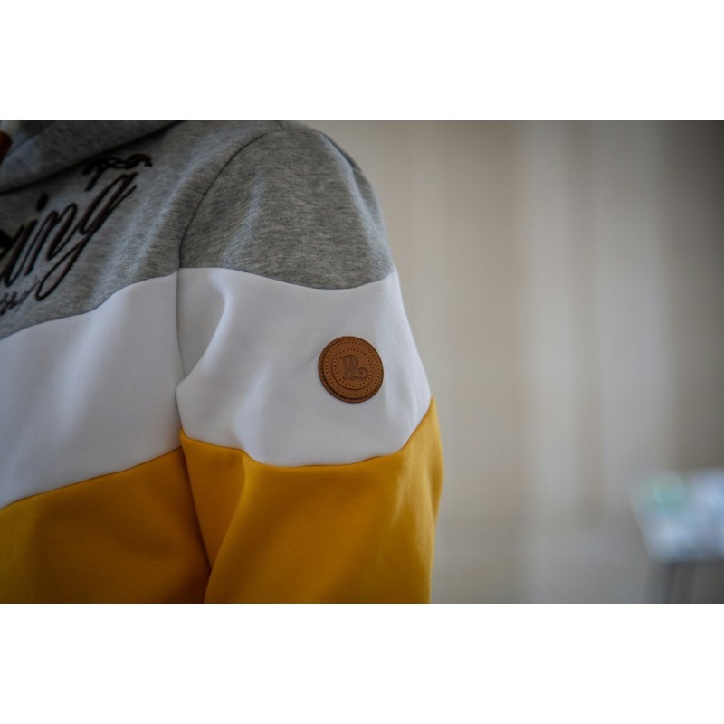 Sweat tricolore à capuche. Trois bandes grises, blanches et jaunes. Poche centrale, bord côte élastique en bas et au bout des manches. Cordon de serrage au niveau de la capuche. Logo Pénélope au centre.